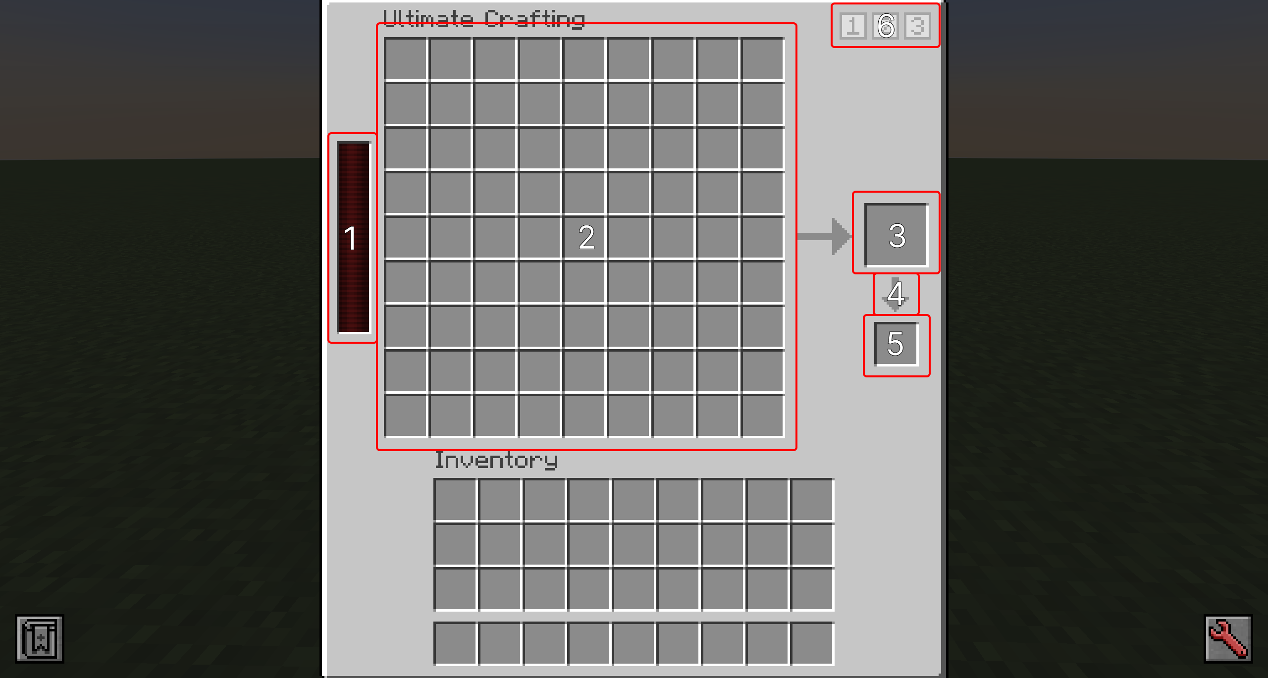 - Saved Recipe Selectors: Shift-click on one of these icons to save the pattern in the Crafting Grid. Click on the icon to select the recipe. Shift-clicking on a saved recipe will delete it.